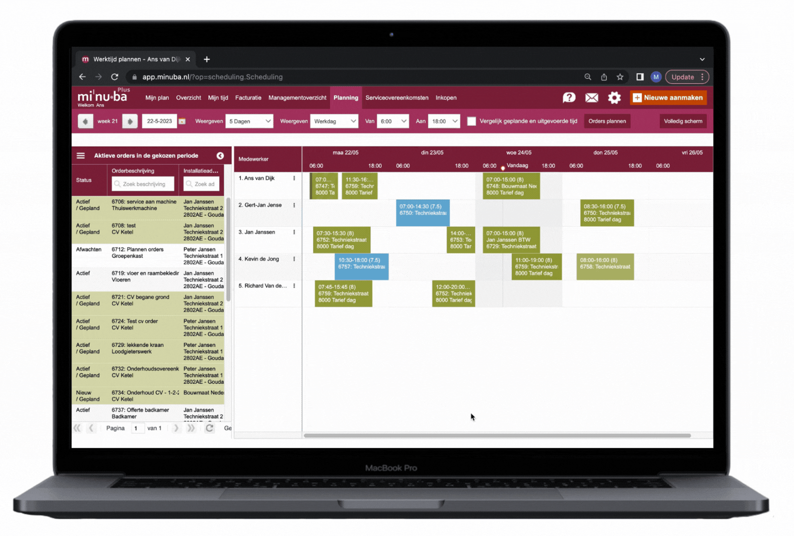 Het planningsprogramma van Minuba maakt het ook gemakkelijk om de actieve orders toe te wijzen aan de medewerkers en om planningen te verplaatsen en te kopiëren indien nodig.