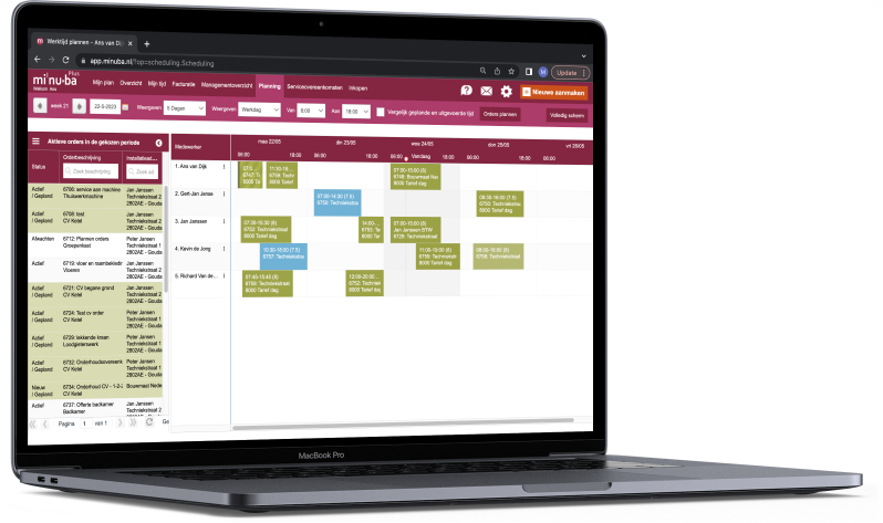Met de planning in Minuba behoud je altijd het overzicht. Je kunt eenvoudig zien wanneer je medewerkers beschikbaar zijn, zodat je weet wanneer je bedrijf ruimte heeft voor nieuwe taken.