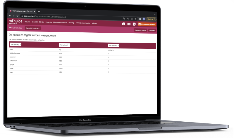Ontvang een offertelijst van de hoofdaannemer of opdrachtgever en laad deze eenvoudig in de projectbeheermodule van Minuba. Uiteraard kun je ook handmatig je activiteiten toevoegen. Wanneer de voortgang op bouwvergaderingen wordt vastgesteld, kun je het voortgangspercentage van de verschillende activiteiten invoeren in de offertelijst in de Minuba projectbeheer-module.