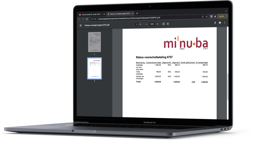 Minuba maakt het gemakkelijk om de eindafrekening te tonen op de tweede pagina van de factuur, waardoor de hoofdaannemer een overzicht krijgt van het totale bedrag van het project, dat wat je eerder hebt gefactureerd en wat er nu wordt gevraagd. Op de order kun je gemakkelijk overzicht krijgen van de voorschotfacturen die zijn aangemaakt.