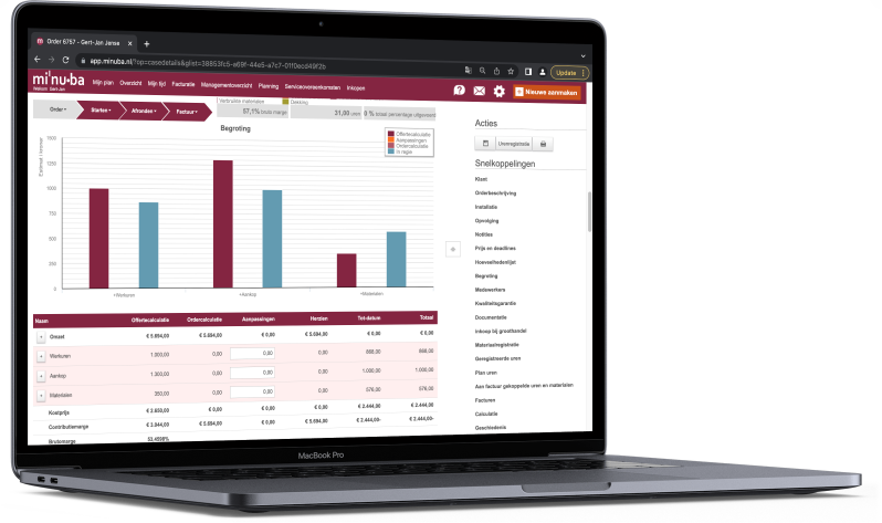 Terwijl je grip houdt op je offertelijst, kun je een kostenbegroting maken in Minuba, waarbij je zelf de posten definieert. Dit geeft je voortdurend een bijgewerkt overzicht en controle over de projectkosten. Lees meer over het budget hier.