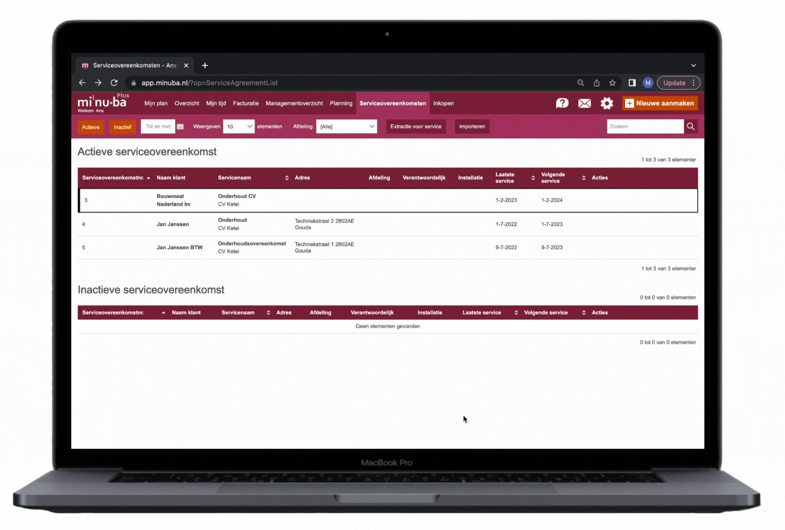 Dit kan bijvoorbeeld zijn dat je jouw klanten een serviceovereenkomst aanbiedt waarin je één keer per jaar hun dakgoten schoonmaakt. Minuba's serviceovereenkomst-module vereenvoudigt en optimaliseert je werkproces wanneer je herhaalde orders van jouw klanten hebt.