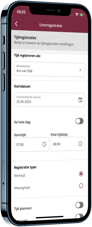 - Gemakkelijke tijdregistratie voor je medewerkers, waar ze zich ook bevinden