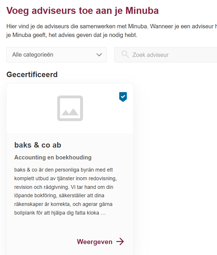 Wanneer je besluit met welke adviseur je in Minuba wilt samenwerken, kun je op een specifieke adviseur klikken en meer lezen over wat deze biedt.