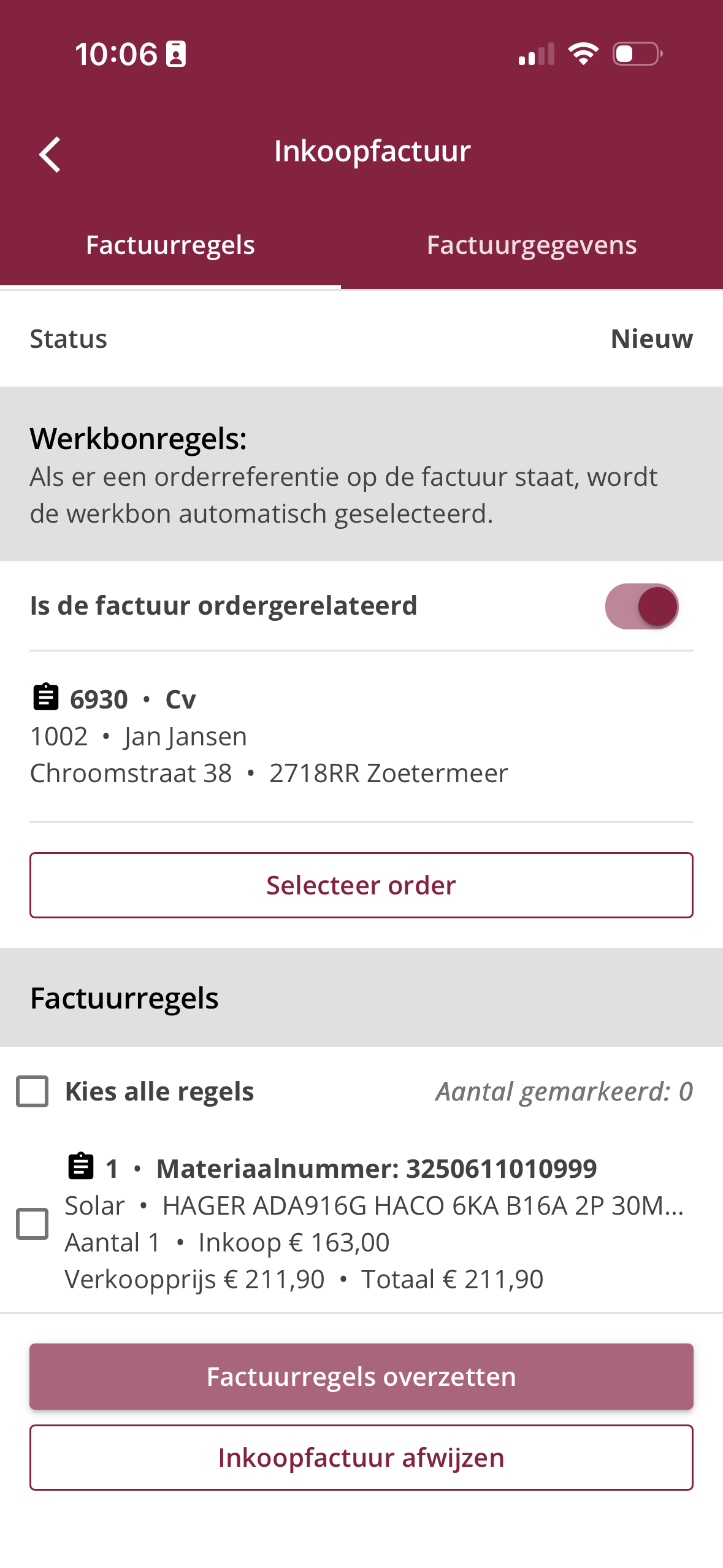 Als je op ‘Bekijk factuur’ klikt, kom je in het overzicht van de inkoopfactuur. Hier kun je de factuur in detail bekijken, zoals de factuurregels en of deze gekoppeld is aan een order. Je ziet ook welke regels al zijn overgezet naar een werkbon en welke nog niet.
