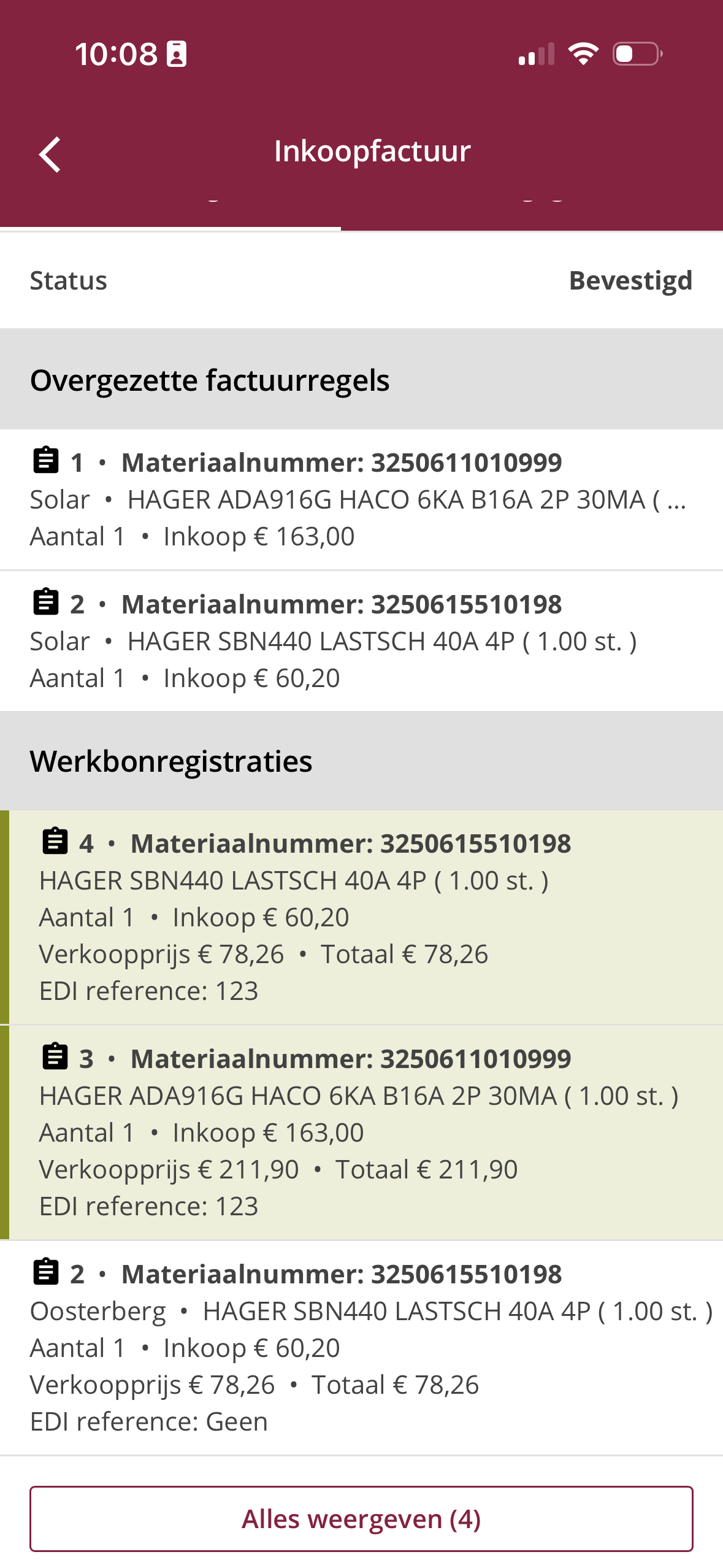 Wanneer je een order hebt geselecteerd, kun je alle materiaalkoppelingen op die order bekijken. Factuurregels die al aan de order zijn toegevoegd, worden groen gemarkeerd en bevatten een EDI-referentie.