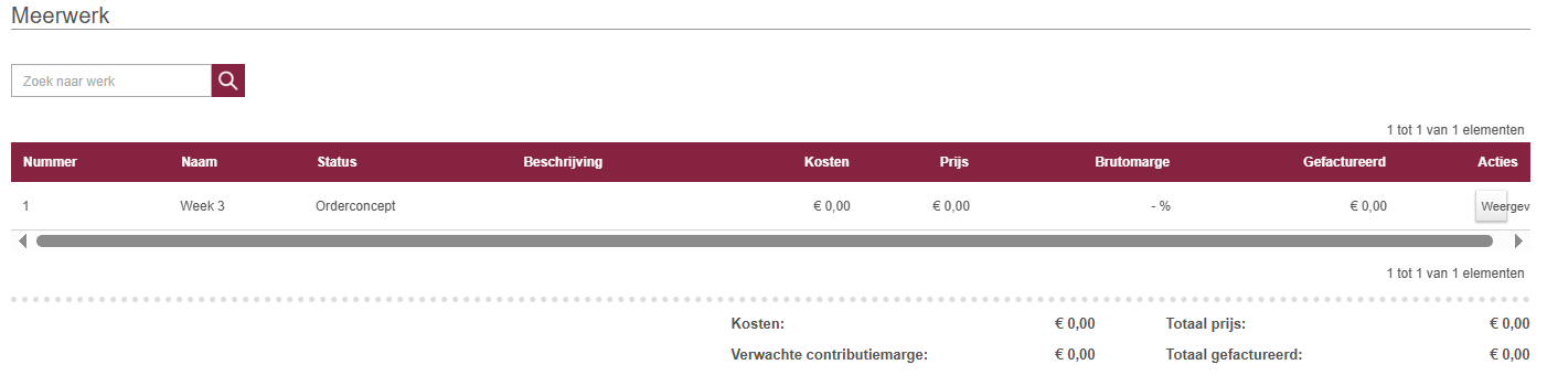Op je hoofdorder zie je een tabel met al het 'Meerwerk' op de order. In de tabel zie je de kosten, prijs, dekking enz. van het meerwerk. Je kunt ook in de tabel zoeken om het meerwerk waar je naar op zoek bent gemakkelijk te vinden.