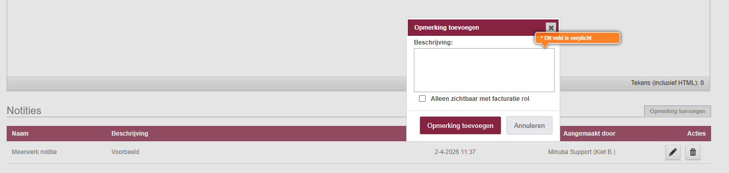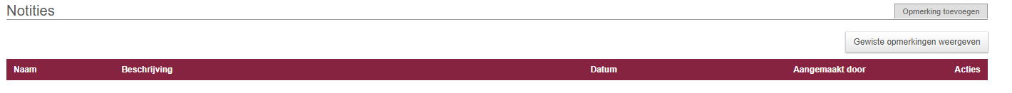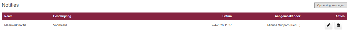 In het overzicht van je notities kun je de naam, beschrijving, datum en wie de notitie heeft aangemaakt zien. Je hebt ook de mogelijkheid om de notitie te bewerken en te verwijderen. Verwijderde notities kun je altijd opnieuw bekijken door op de knop ‘Verwijderde notities tonen’ te klikken.